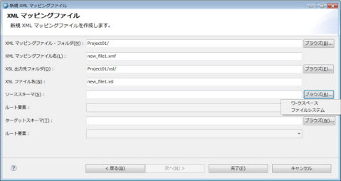 新規XMLマッピングファイル ダイアログの ターゲットスキーマ に変換結果のXMLのスキーマとして参照するXML SchemaまたはWSDLのフィアル名を指定します。さらに、そのルート要素を選択します。