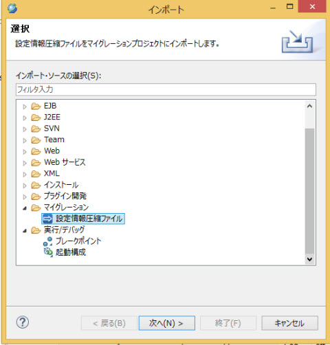 インポート ダイアログで マイグレーション > 設定情報圧縮ファイル を選択して 次へ ボタンを押下すると 移行元設定情報のインポート ウィザードが表示されます。
