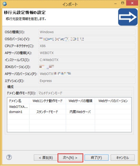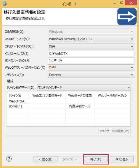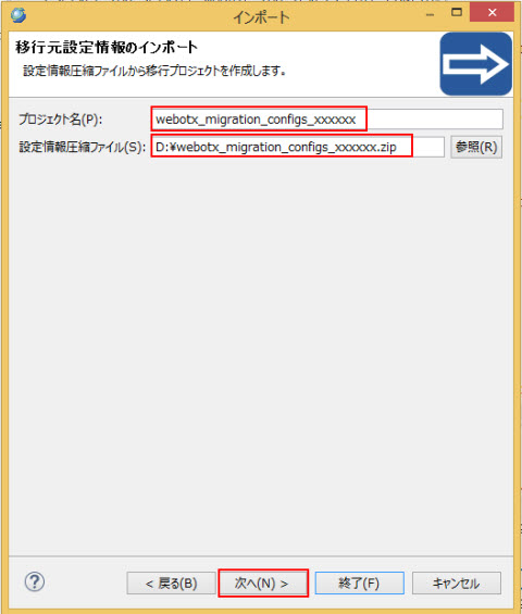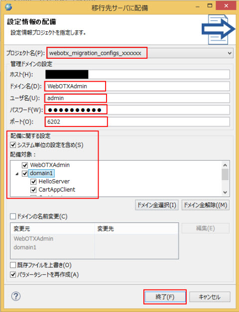 移行先設定情報の設定 ウィザードで各項目を移行先サーバの情報に合わせて設定して 終了 ボタンを押下すると、マイグレーションプロジェクト webotx_migration_configs_xxxxxx が生成されます。