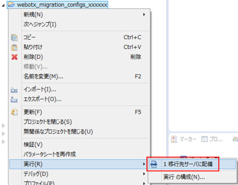webotx_migration_configs_xxxxxxを選択し、右クリックメニュー 実行 > 移行先サーバに配備 を選択します。