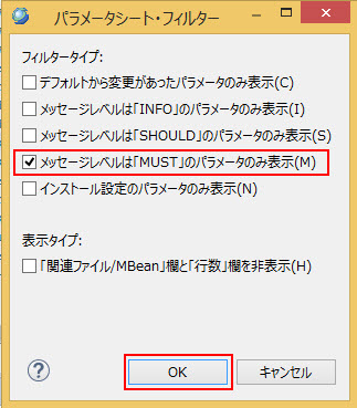 パラメータ・フィルター ダイアログが表示されて、 メッセージレベルは「MUST」のパラメータのみ表示 をチェックしてOKボタンを押下します。