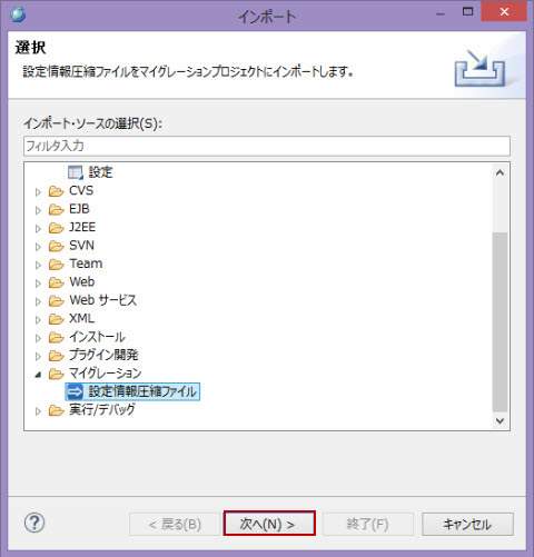 マイグレーション > 設定情報圧縮ファイル を選択し、 次へ を押下します。