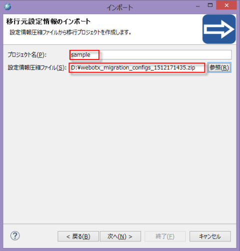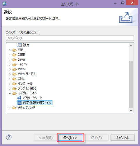 設定情報の エクスポート ダイアログで 終了 ボタンを押下すると、マイグレーションプロジェクトをzipファイルにエクスポートします。