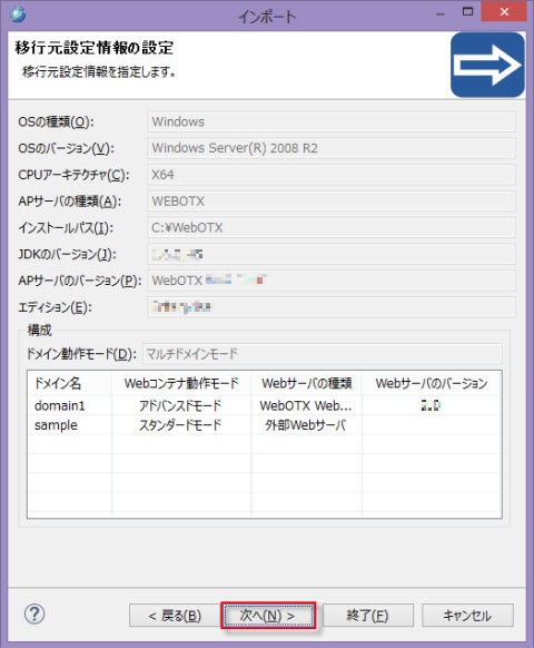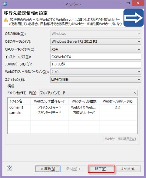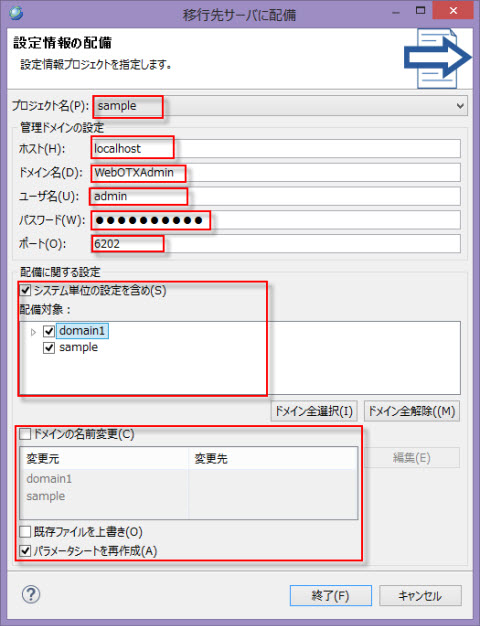 移行先サーバに配備 ダイアログで各項目を設定して、終了 ボタンを押下して、移行先サーバの配備を行います。
