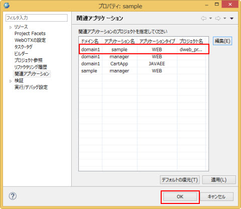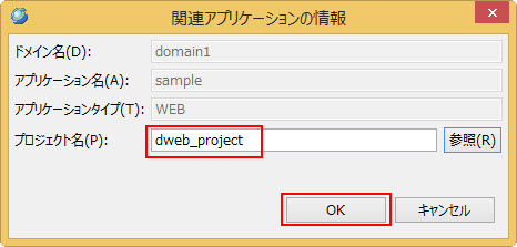 プロジェクト名 のテキストボックスで入力するか 参照 ボタンを利用して、アプリケーションの関連プロジェクトを指定し、OK ボタンを押下して、プロパティー ダイアログに戻ります。