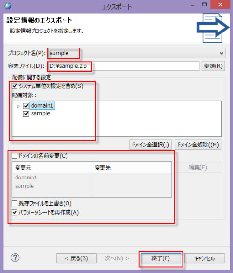 | ドメインの名前変更 | エクスポートする際に、ドメイン名を変更するかどうかを指定します。 選択:ドメイン名を変更する 非選択:ドメイン名を変更しないで、移行元のdomain名をそのまま利用する |