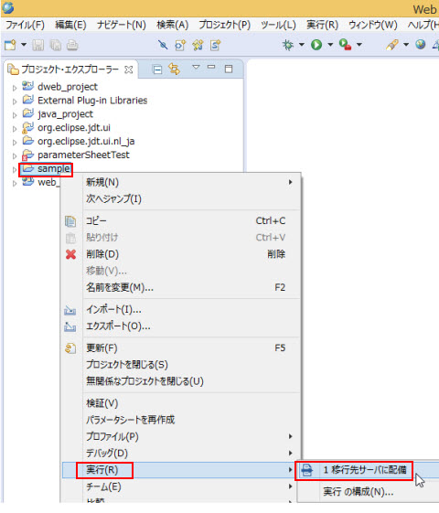 マイグレーションプロジェクトのプロジェクト名を選択し、右クリックメニュー 実行 > 移行先サーバに配備 を選択します。