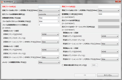 標準設定では、「送信ファイル名」と「受信ファイル名」の設定にはファイル名を含むフルパスを指定する必要があります。それぞれ「送信/受信ファイル名にパターンを有効にする」をtrueにすることで正規表現や特殊文字が使用可能になります。