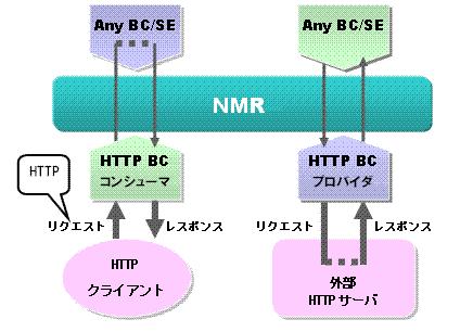 NMR から受け付けたメッセージエクスチェンジに格納されたInメッセージをHTTPリクエストに変換して、エンドポイントで定義されたHTTPサーバに送信し、HTTPサーバからのoutかFaultかErrorに相当するレスポンスメッセージを待ち合わせます。 |