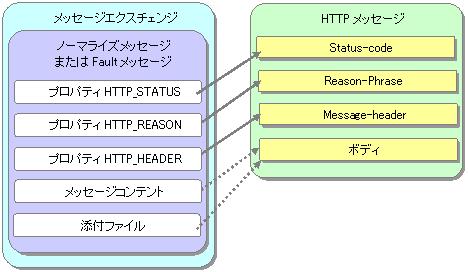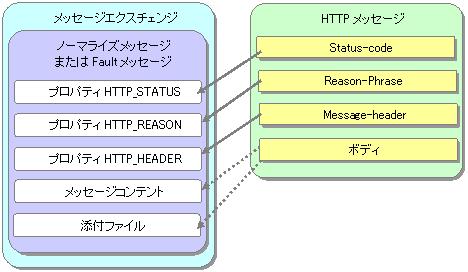 HTTPメッセージを受け取った後のJBIコンテナ側の処理でFaultメッセージを返した場合、その内容のままHTTPメッセージを返します。 FaultメッセージにHTTP_STATUSプロパティがなければ、500レスポンスをHTTPクライアントに返信します。 |