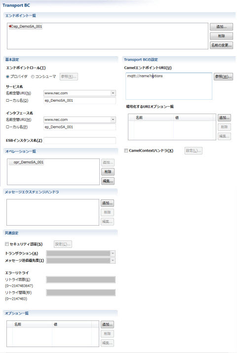 共通項目(セキュリティ認証、トランザクション、メッセージ送信優先度、エラーリトライ)を設定します。 |