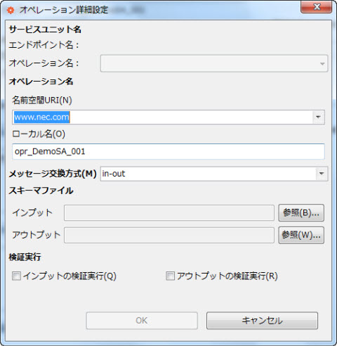 対象SUフォルダのMETA-INFフォルダのschemaフォルダ配下にあるスキーマファイルの相対パスを指定します。 指定したスキーマファイルは、後述のインプット検証/アウトプット検証を選択することで実行時のメッセージ検証に利用することができます。 選択しなかった場合も、XSLT SE による変換の定義の際のインプット/アウトプットスキーマとして利用することができます。 [メッセージ交換方式を指定した場合のみ設定可能] |