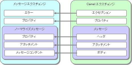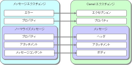 Transport BCのInboundのリクエスト受信処理、およびOutboundのレスポンス受信処理では、 Camelコンポーネントから受け取ったエクスチェンジをメッセージエクスチェンジに変換(ノーマライズ)します。 Camelのエクスチェンジとメッセージエクスチェンジの各要素は以下のように対応します。