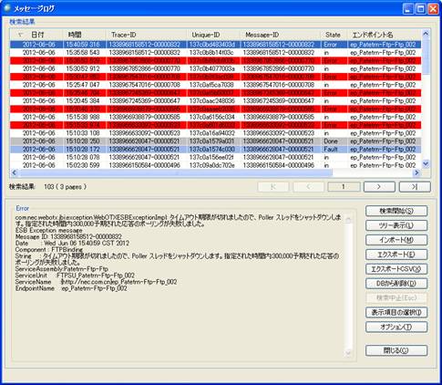 | 日付 | 時間 | MEP | State | 送信元ロール | 送信元コンポーネント名 | 送信先コンポーネント名 | エンドポイント名 | Trace-ID | Unique-ID |