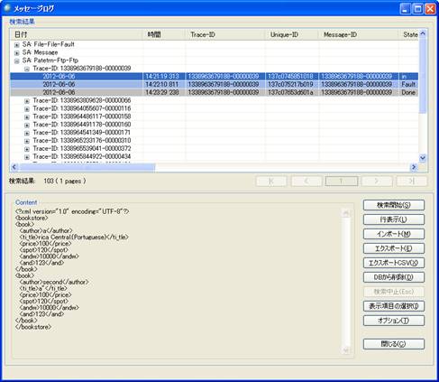 「メッセージログ」ダイアログでは、ログの検索やログのエクスポート、インポート、DBからログの削除などの操作ができます。