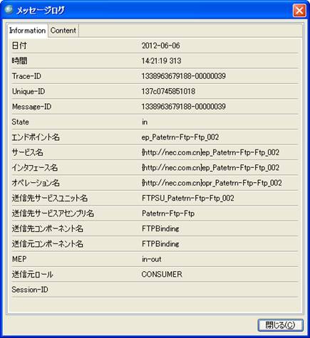 ------<ランダムUUID>------ 日付 時間 MEP State 送信元ロール 送信元コンポーネント名 送信先コンポーネント名 送信先サービスユニット名 送信先サービスアセンブリ名 エンドポイント名 サービス名 インタフェース名 オペレーション名 Message-ID Session-ID Trace-ID Unique-ID <メッセージ本体(メッセージがフォルトの場合はフォルトメッセージ、エラーの場合はエラーメッセージ)> ------<ランダムUUID>------ (以下、繰り返し) ・ ・ ・ |
