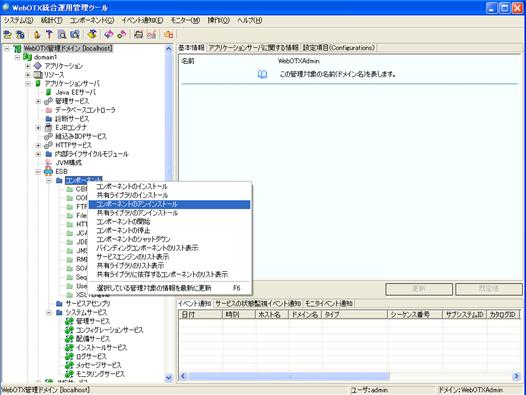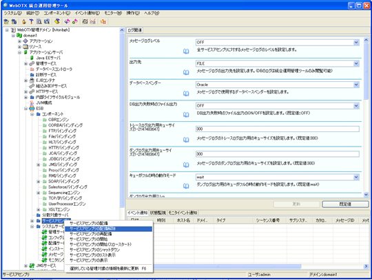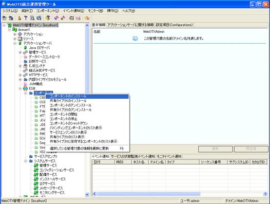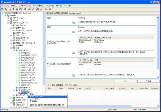 『統合運用管理ツール』を使用すると、WebOTX ESB実行環境内へのコンポーネントのインストール/アンインストール作業や、サービスアセンブリの配備/配備解除といった運用操作を、GUIインタフェースを使用して容易に行うことができるようになります。また、WebOTX ESBの実行環境で動作するコンポーネントやサービスアセンブリなどの管理対象に対するコンフィグレーション情報の更新やオペレーション実行、統計情報採取などの管理操作をスムーズに行えるようになります。