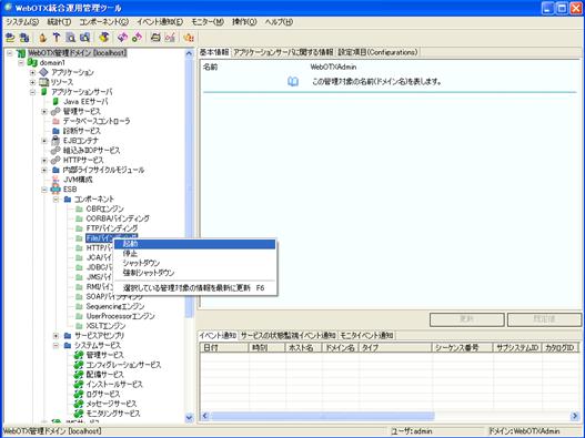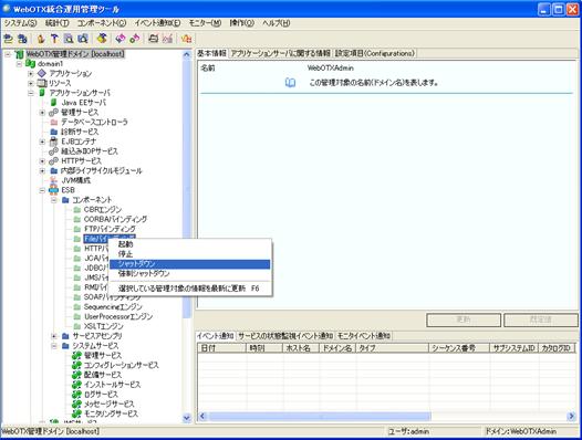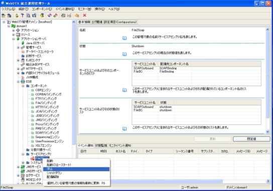 コンポーネント(バインディングコンポーネント、サービスエンジン)のシャットダウンを行うには、[ESB]-[コンポーネント]-[シャットダウンするコンポーネント名]のノードを右クリックして表示される操作の一覧から「シャットダウン」を選択します。