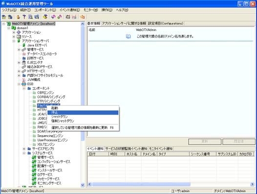 "コンポーネント(バインディングコンポーネント、サービスエンジン)の停止を行うには、[ESB]-[コンポーネント]-[停止するコンポーネント名]のノードを右クリックして表示される操作の一覧から「停止」を選択します。