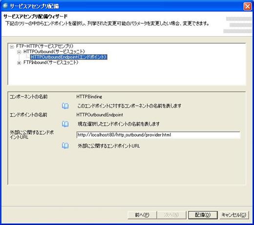パラメータを変更するには、「パラメータ変更画面」においてサービスアセンブリ(図では「FTP-HTTP(サービスアセンブリ)」)のツリーにある「エンドポイント」ノードをクリックすると、当該エンドポイントの変更可能なパラメータがツリー下の属性グループに表示されます。変更可能なパラメータの値を変更して「配備(D)」を押すと、変更したパラメータを優先させて、サービスアセンブリを配備します。