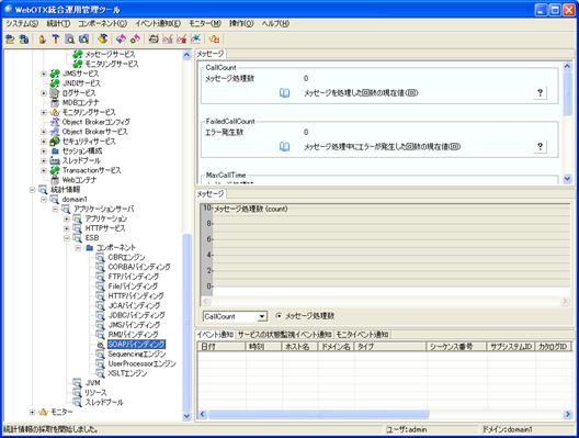 図のように、WebOTX ESBの実行環境を含むドメインにアクセスすると、画面左側で示されている管理対象ツリー構成において、 [ドメイン(図ではdomain1)]-[統計情報]-[アプリケーションサーバ]ノードの配下に「ESB」ノードが表示されます。 さらにその配下には「コンポーネント」、「サービスユニット」のノードが表示され、それぞれの配下には実行環境で動作する コンポーネント、サービスユニットを示すノード(モニタリング対象)が表示されます。 また、画面右上部には、ツリー上の指定したノード(モニタリング対象)が持つ統計情報が表示されます。