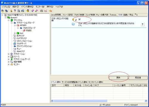 (1) プロセスグループを選択して「ESB」タブを開きます。「ESB JBIコンテナの起動」チェックボックスにチェックを入れて更新してください。