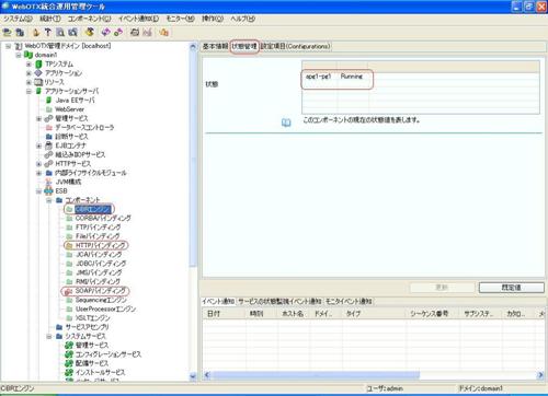 コンポーネントの状態を取得するには、[ESB]-[コンポーネント]ノードを展開します。子ノードの「コンポーネント名」のアイコンはコンポーネントの状態を表示します。【図1.2.2a】のツリーノードのアイコンにより、HTTPバインディングの状態が処理中、SOAPバインディングの状態がエラーとなっていることを確認できます。