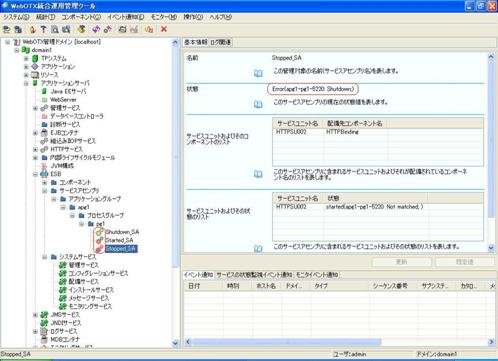 また、[ESB]-[サービスアセンブリ]-[サービスアセンブリ名]のノードをクリックすると、右画面にサービスアセンブリの状態が表示されます。【図1.2.4b】により、Stopped_SAの状態がエラー(Error)となっていることや、問題となるプロセスグループのプロセス情報が表示されます。