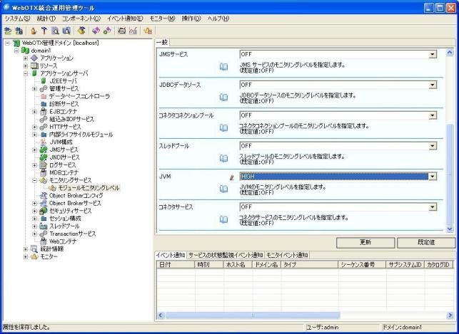 「<ドメイン名>」-「アプリケーションサーバ」-「モニタリングサービス」-「モジュールモニタリングレベル」を選択し、画面右側に表示される設定項目「JVM」の値を LOW もしくは HIGH に変更し、「更新」ボタンを押します。
