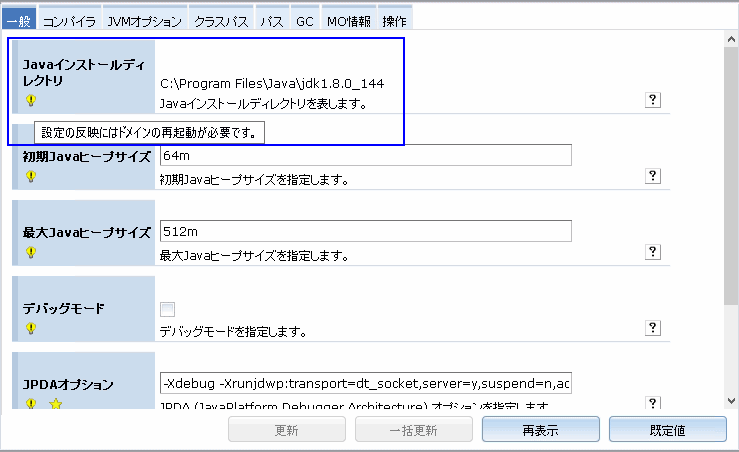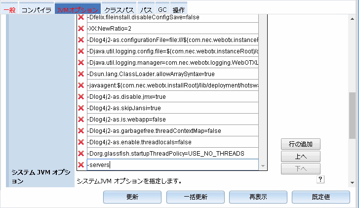 | 「配備時に指定するコンテキスト名の記述チェックを行う」 | アプリケーションを配備する場合、配備時に指定するコンテキストルート名の記述チェックを行うのかどうかを設定します。 | ON |