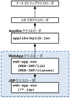 まずServletの視点から解説します。クラスローダのロード処理順の概要図を以下に示します。 Servletの視点では、JSPクラスローダは無関係である点に注意してください。