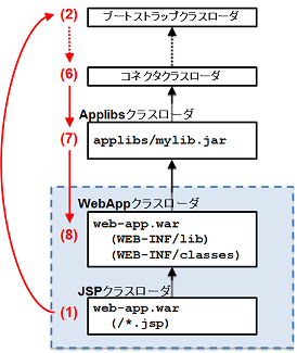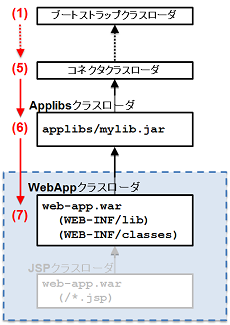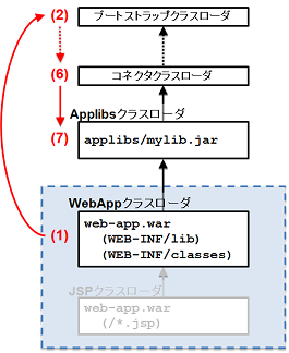 (2)はWebAppクラスローダ特有の探索方法であり、WebAppクラスローダがロードするクラスを優先的に利用します。