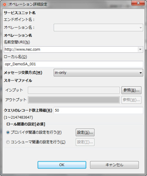 BCが提供するサービス名と名前空間を指定します。 エンドポイントロールがコンシューマの場合、呼び出し先のサービス名と名前空間を指定します。 |
