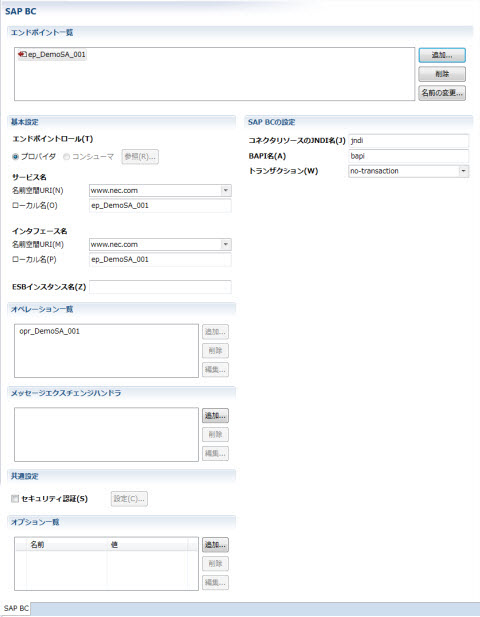 Sequencing SEを使用して2つ以上のSAP BCを連携する構成で、それぞれのSAP BCをグローバルトランザクションに参加させる場合、全てのSAP BCで同じJNDI名を指定する必要があります。