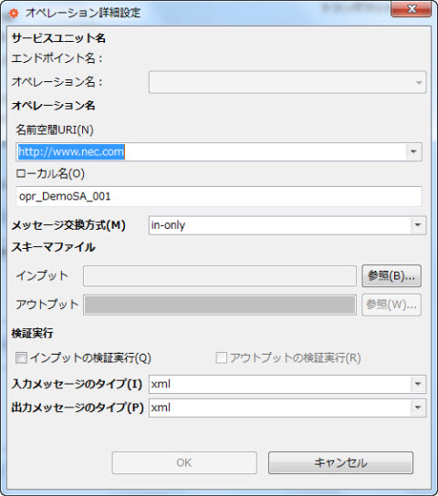 対象SUフォルダのMETA-INFフォルダのschemaフォルダ配下にあるスキーマファイルの相対パスを指定します。 指定したスキーマファイルは、後述のインプット検証/アウトプット検証を選択することで実行時のメッセージ検証に利用することができます。 選択しなかった場合も、XSLT SE による変換の定義の際のインプット/アウトプットスキーマとして利用することができます。 [メッセージ交換方式を指定した場合のみ設定可能] |