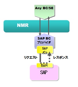 BAPI呼び出し処理で例外が発生すると、例外メッセージを格納したメッセージエクスチェンジを NMR に返却します。 |