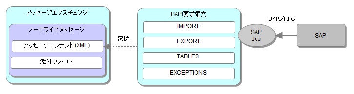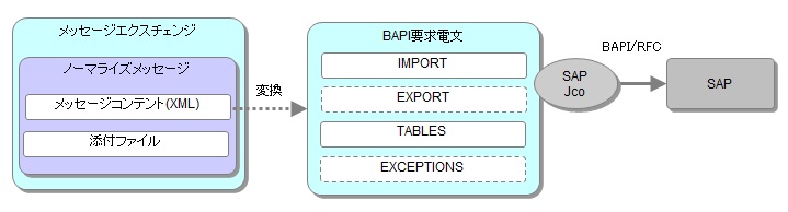 SAP BCのOutboundのリクエスト送信処理では、 メッセージエクスチェンジから受け取ったXMLメッセージをBAPIの要求電文に変換(デノーマライズ)します。要求電文には通常IMPORT、TABLESのみが含まれます。添付ファイルは使用しません。