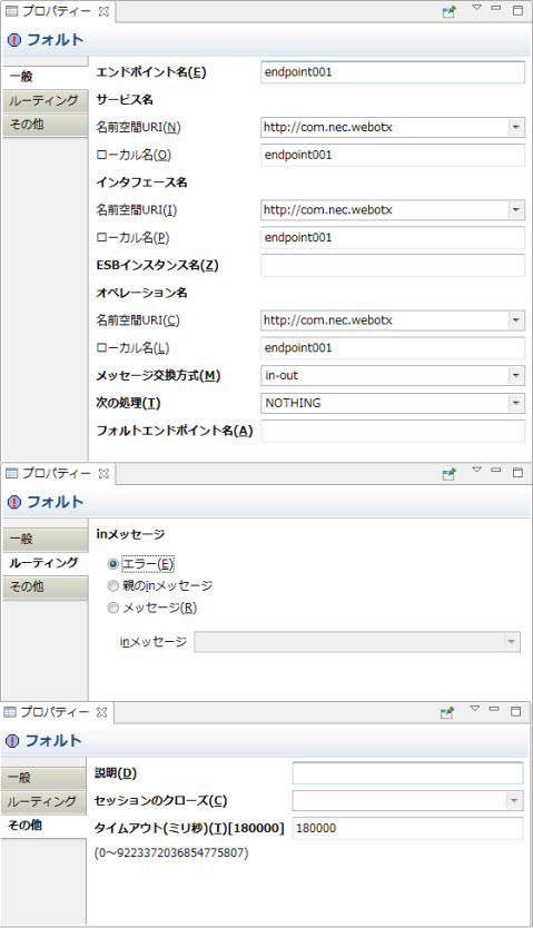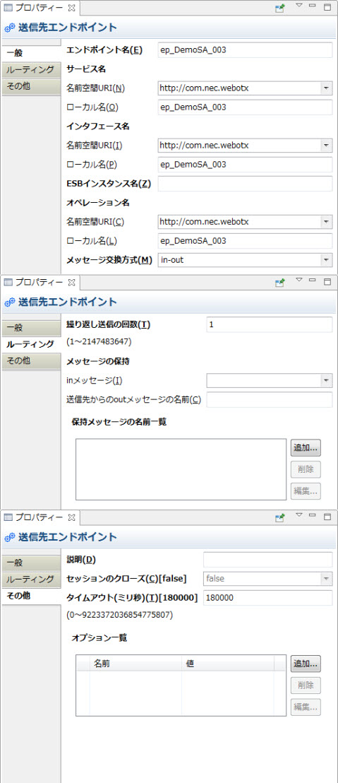 送信先エンドポイントのメッセージ交換方式を指定します。サービスユニット選択時に自動で設定されます。 ※ブロードキャストにある場合、設定できないようにする。(ブロードキャストのメッセージ交換方式の値を利用する、もしブロードキャストのメッセージ交換方式がない場合、in-onlyに固定) |