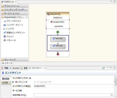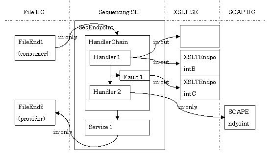 即時返信が有効の場合、呼び出し元へdoneを返信します。 新たなメッセージエクスチェンジを生成して、呼び出し元からのメッセージエクスチェンジに格納されたinデータを新たに生成したメッセージエクスチェンジに入れて、定義した呼び出し順の一番目のサービスへ送信します。 |