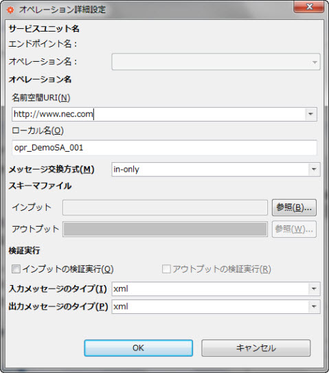 実行時に、アウトプットで指定したスキーマファイルでのメッセージの検証を実施します。 選択時には、スキーマファイルのアウトプットの指定は必須項目となります。 [メッセージ交換方式を指定した場合のみ設定可能] |