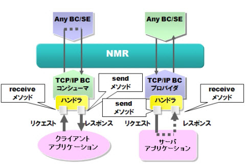 NMR からメッセージエクスチェンジ受け取り、Outメッセージを取りだしてTCP/IPハンドラのsendメソッドのパラメータとして渡します。 sendメソッドにおいて外部アプリケーションと通信を行います。 |