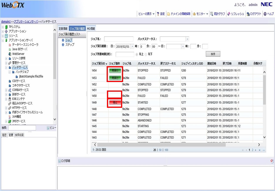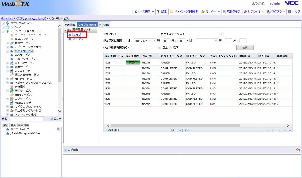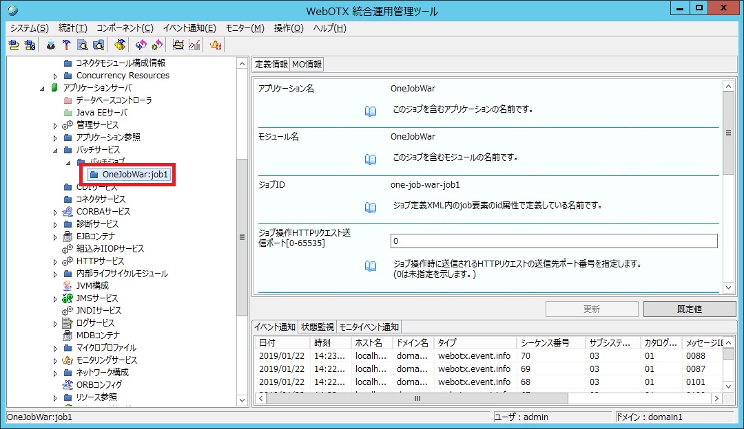 2. ツリービューより「<ドメイン名>」-「アプリケーションサーバ」-「バッチサービス」-「バッチジョブ」-「<ジョブ名>」を選択します。