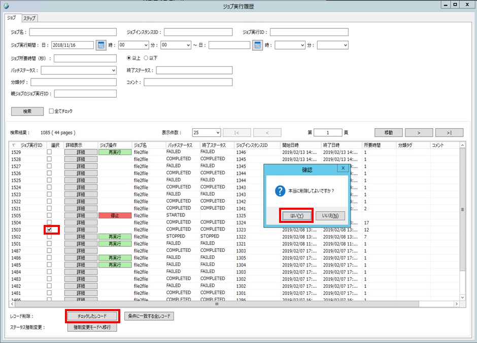 5. 「選択」列で削除するジョブをチェックし、「チェックしたレコード」ボタンをクリックすると、チェックしたジョブを実行履歴から削除します。検索項目に検索する値を設定し、「条件に一致する全レコード」ボタンをクリックすると、検索項目に一致するジョブを実行履歴およびジョブリポジトリから削除します。