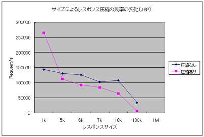 (e)については、クライアント⇔Webコンテナ間のネットワーク速度とWebコンテナが動作しているマシンのCPU性能によって変わってきます。 基本的に、レスポンスデータが少ない場合に圧縮を行うとCPUの無駄使いとなり、圧縮しない場合よりもトランザクション性能が落ちます。ところが、あるサイズ以上のレスポンスデータになると圧縮を行ったほうが行わない場合に比べトランザクション性能が良くなります。この境界点を見極めて、レスポンスを圧縮する最小コンテンツサイズを決定します。