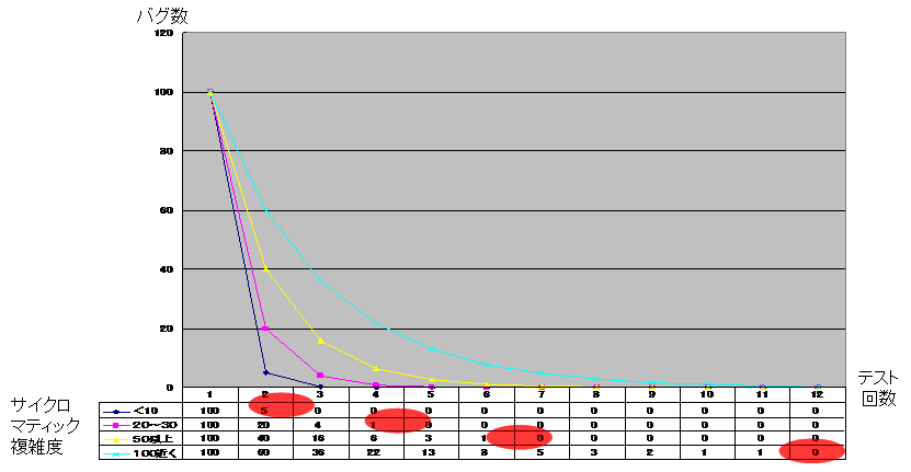 図7.2-1は、100個のバグが1回目のテストで検出された場合、表7.2-1の誤修正率でバグが減少すると仮定した場合のバグ減少曲線です。良い構造であれば3回目のテストでバグはほぼ0件になりますが、構造が悪いとバグが中々減少しません。