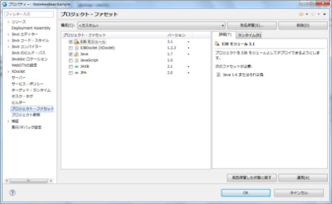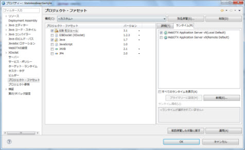 プロジェクト・ファセット 画面で EJB