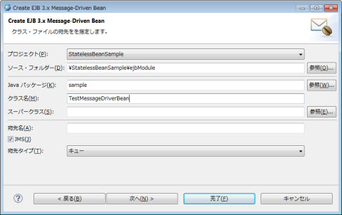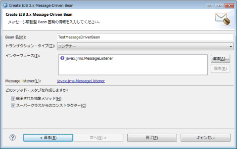 | インタフェース | ビジネス・インタフェースを追加します。 | Javax.jms.MessageListener |