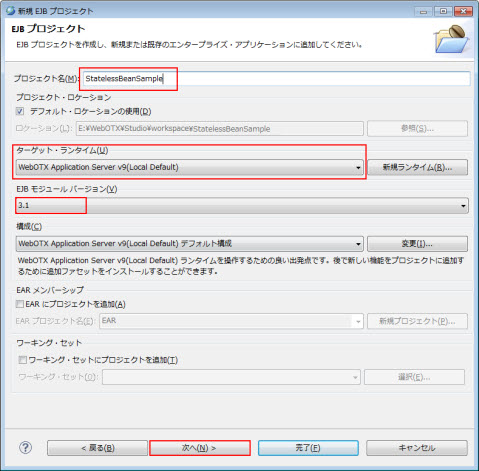プロジェクト名 に新規プロジェクト名StatelessBeanSampleを入力して、