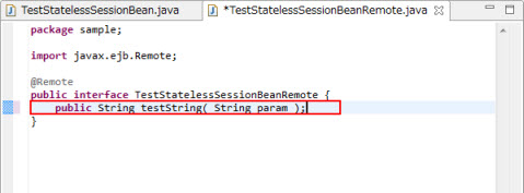TestStatelessSessionBean.java (※ステートフルの場合:TestStatefulSessionBean.java、 Singletonの場合:TestSingletonSessionBean.java) に 次のビジネスメソッドを実装します。