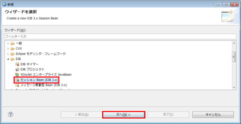 EJB > セッション Bean(EJB 3.x) を選択して、次へ をクリックします。